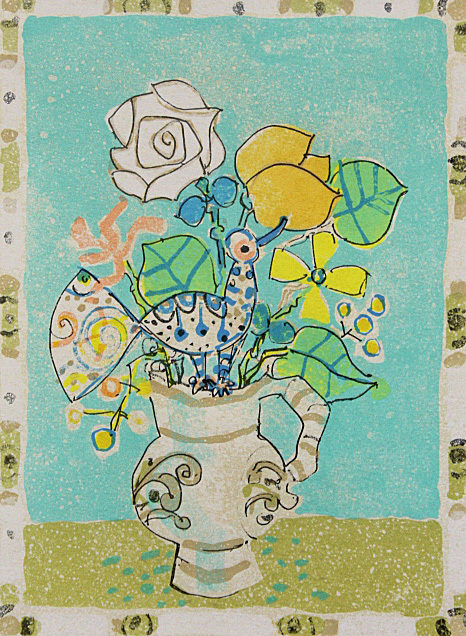 - ■★アイズピリ(Aizpiri)【オレンジの縁取りの花と鳥】 リトグラフ 直筆サイン エディション有り
