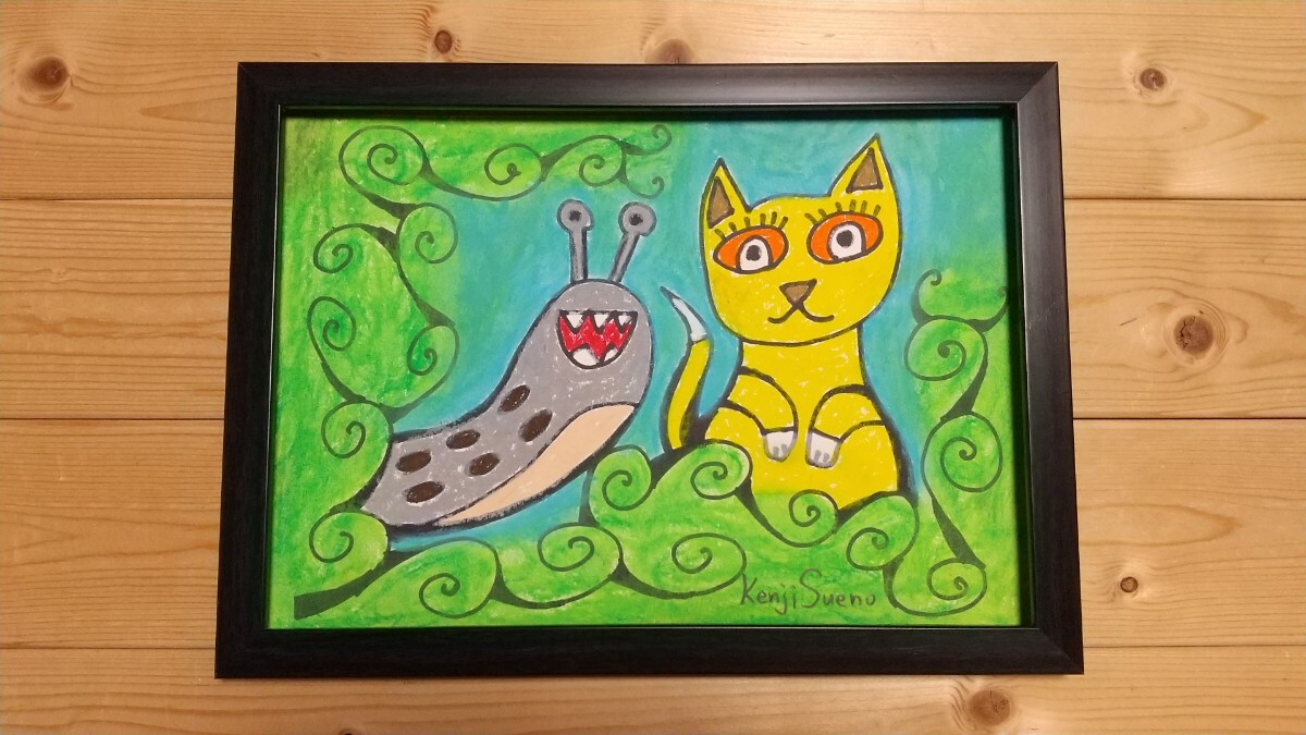 > 【ナメクジとねこ】手描き 肉筆 クレヨン画 絵画 A4サイズ 784,Crayon painting, oil pastel painting, original art 猫 ねこ cat