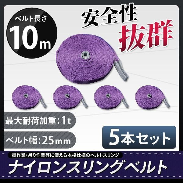 - お買い得 5本セット ナイロンスリングベルト 10m 幅25mm 荷重1000kg 1t 玉掛け ベルトスリング 吊上げ ロープ 牽引