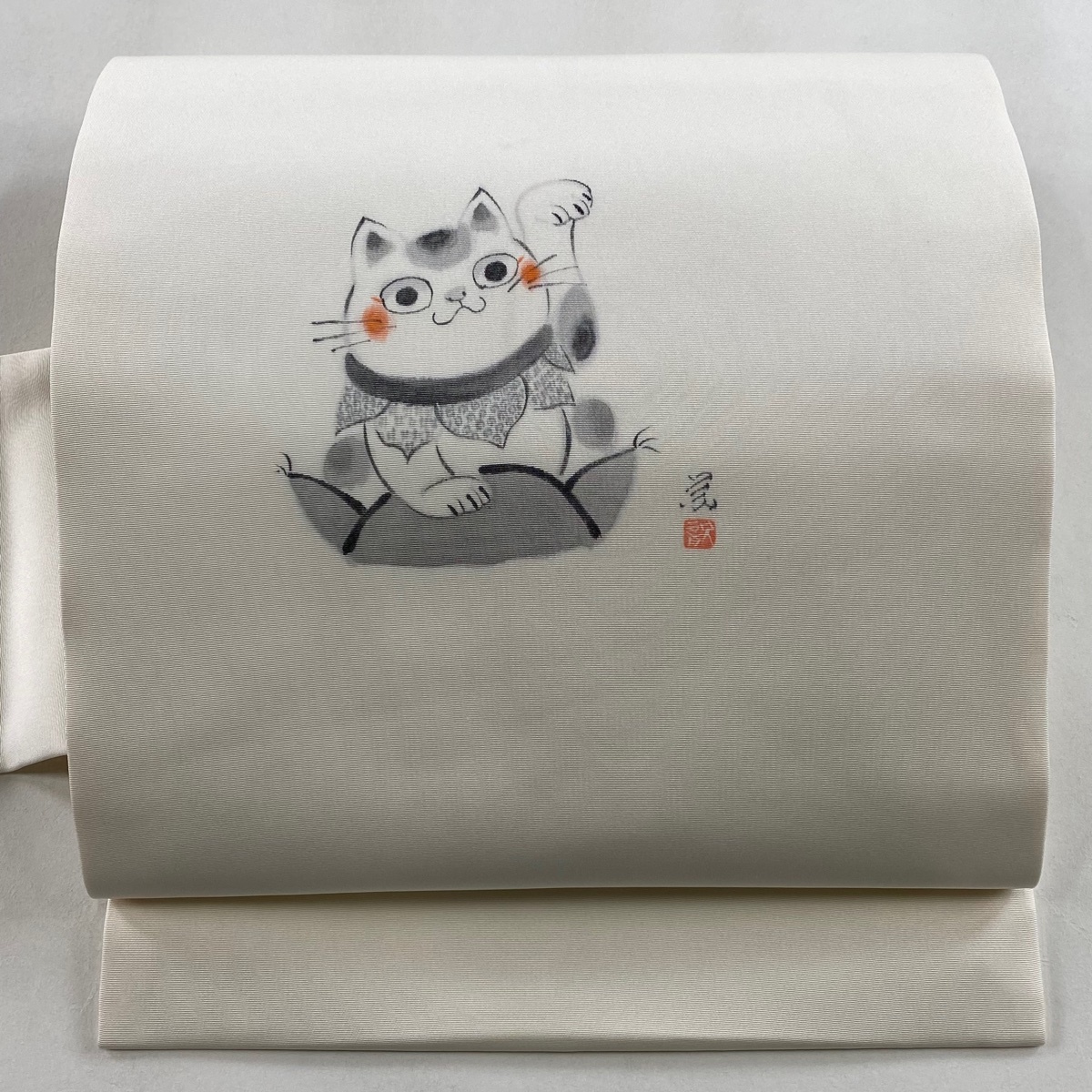- 【在庫一掃】 名古屋帯 美品 逸品 落款 招き猫 灰白 正絹 【中古】