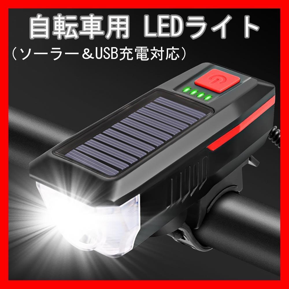 - 自転車 LED ヘッドライト ソーラー USB 充電 ホーンブザー 防水 赤 黒 レッド ブラック LEDライト ヘッドライト フロントライト