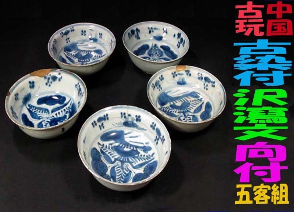 > ☆∽本物保証・中国古陶・明朝時代・古染付向付(小鉢)五客組・見込みに描かれた沢瀉(おもだか)文・金継補修にニュー有り/箱無∽☆