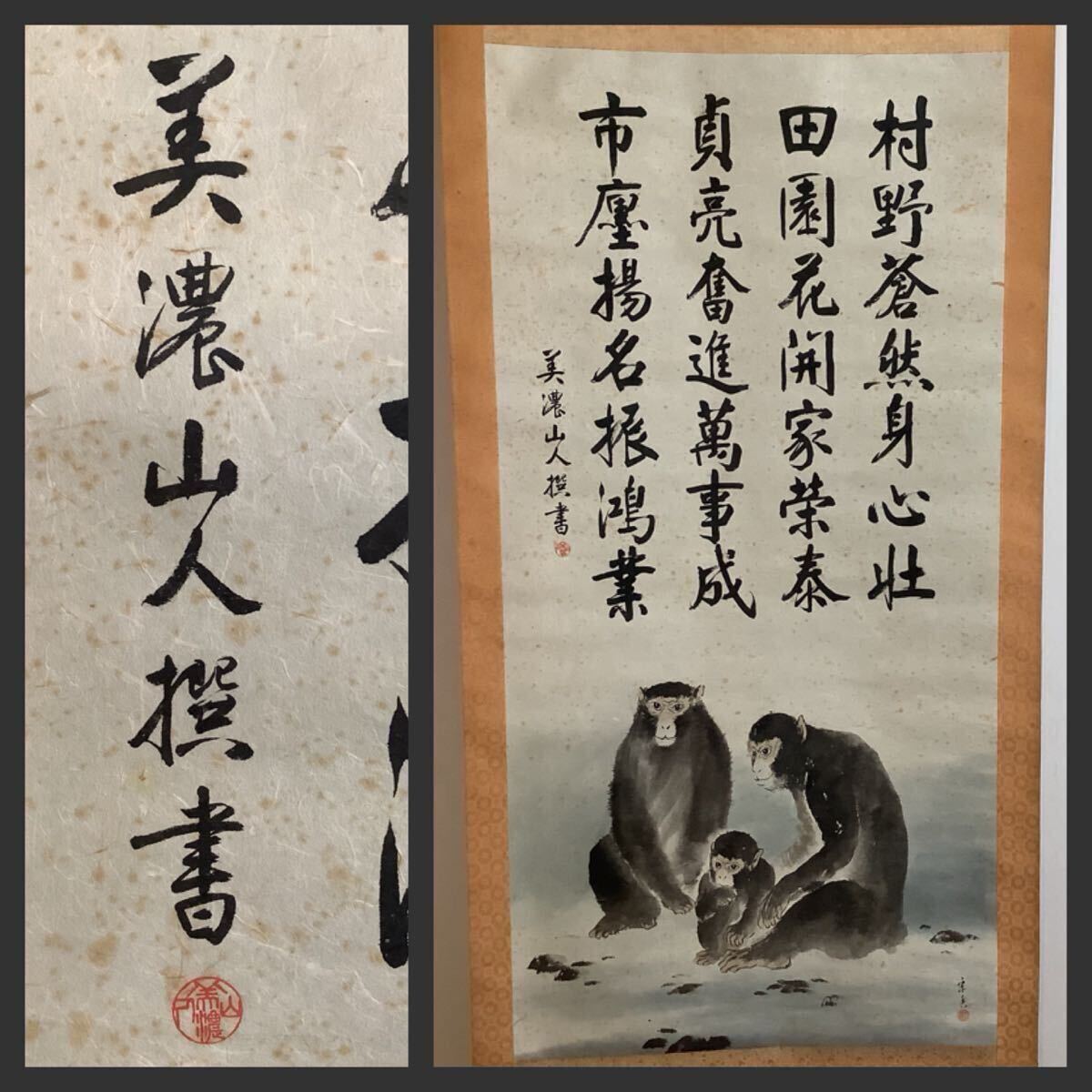 - 【真作】掛軸A773BL[美濃山人賛 林宇香画 干支図]彩色紙本 書いたもの 木箱/日本画 花鳥画 猿 申 保証書付 中国美術 台湾