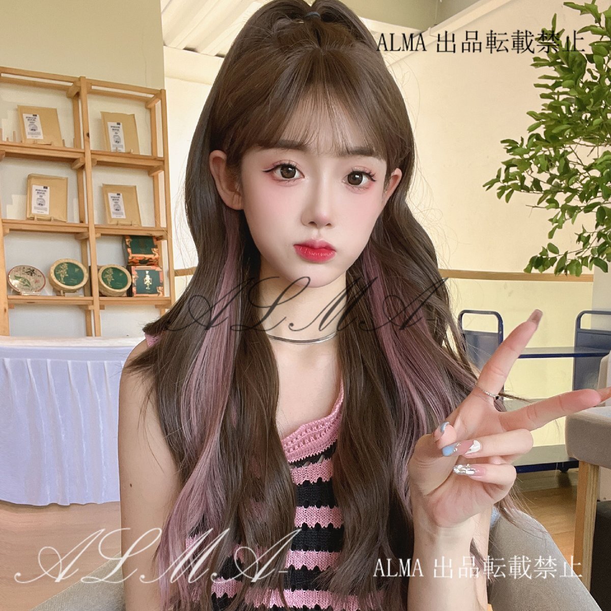 - 新品人毛 ロングヘア 微ウェーブ ピンクハイライト ふんわりナチュラル 可愛らしい つむじ部分手植え 自然に見えますフルウィッグ