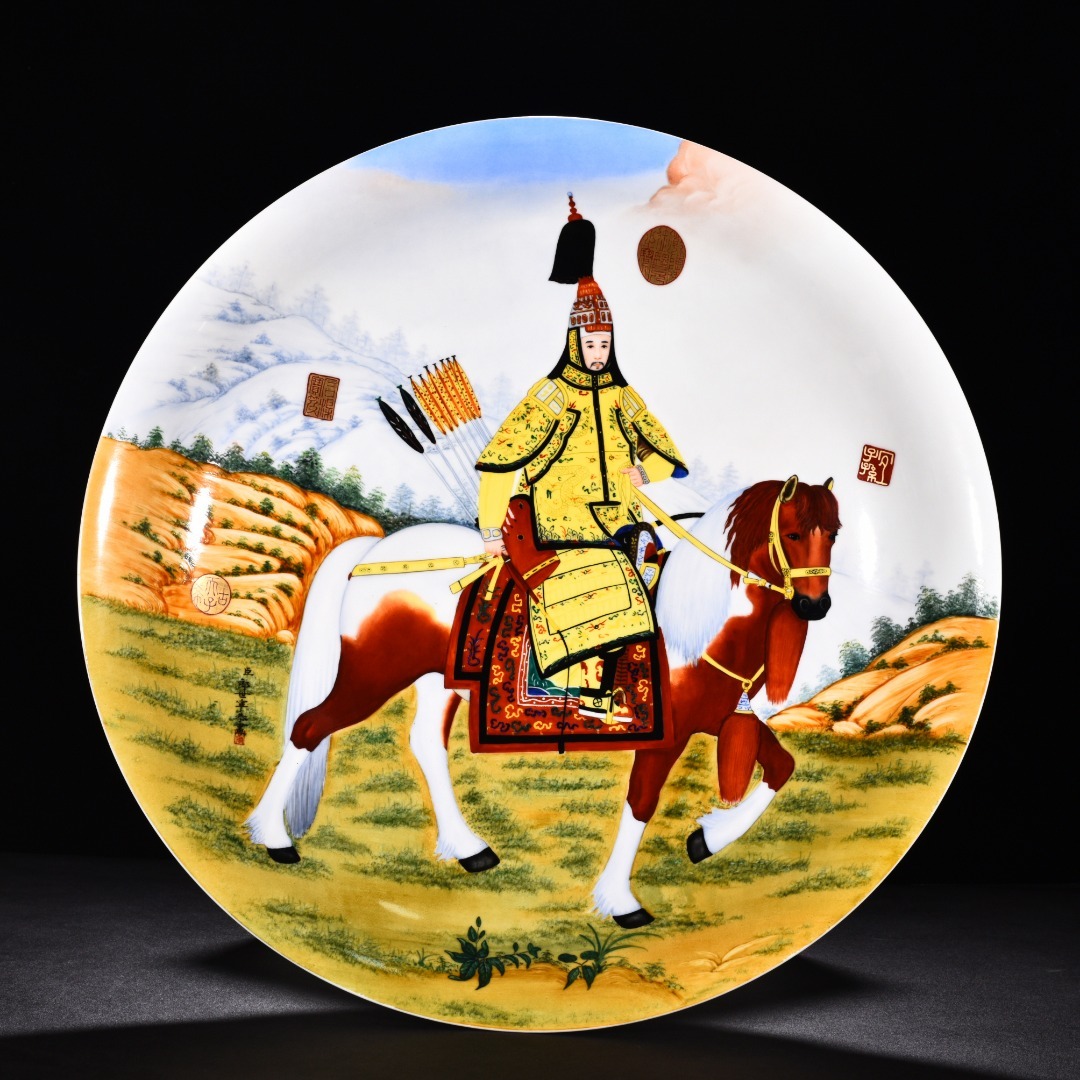 - TA103■中国古玩 唐物 大明乾隆年制款 朗世寧琺瑯彩護獵図大盤 時代物 極上品■