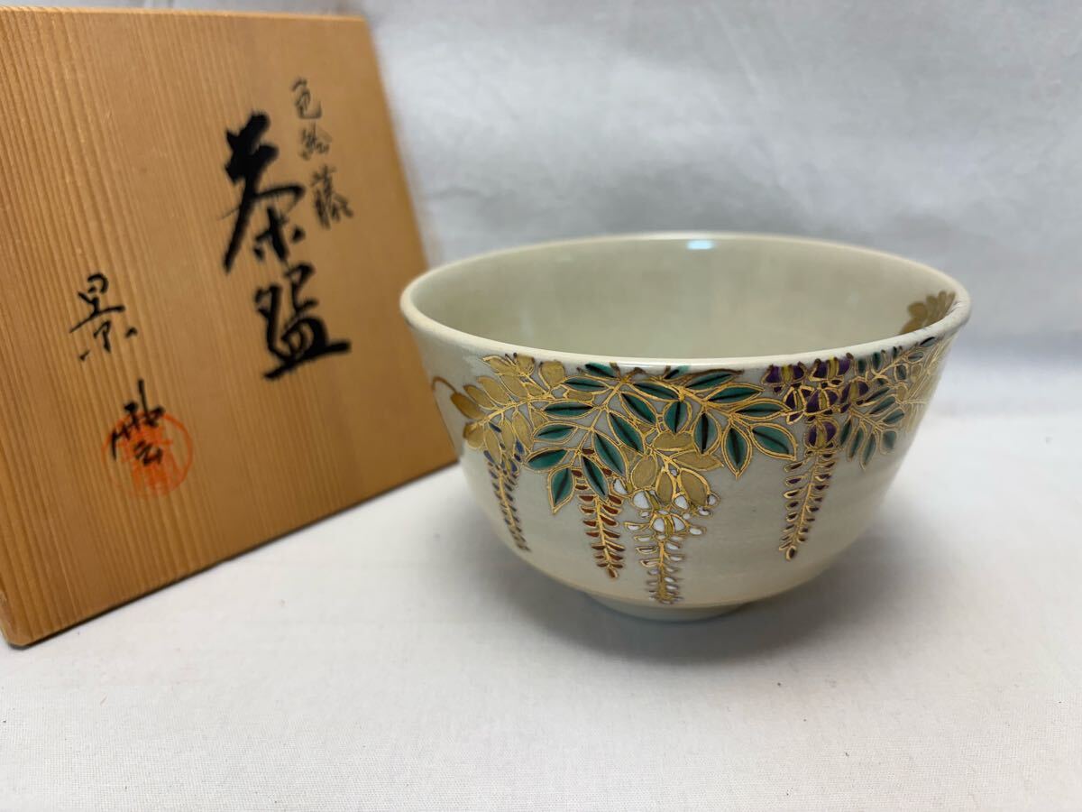 > K04014 ほぼ未使用 茶道具 手塚景雲作 色絵藤 茶碗 陶印 作家物 煎茶道具 茶懐石 茶湯 茶事 茶器 茶具 お稽古 和物 共箱