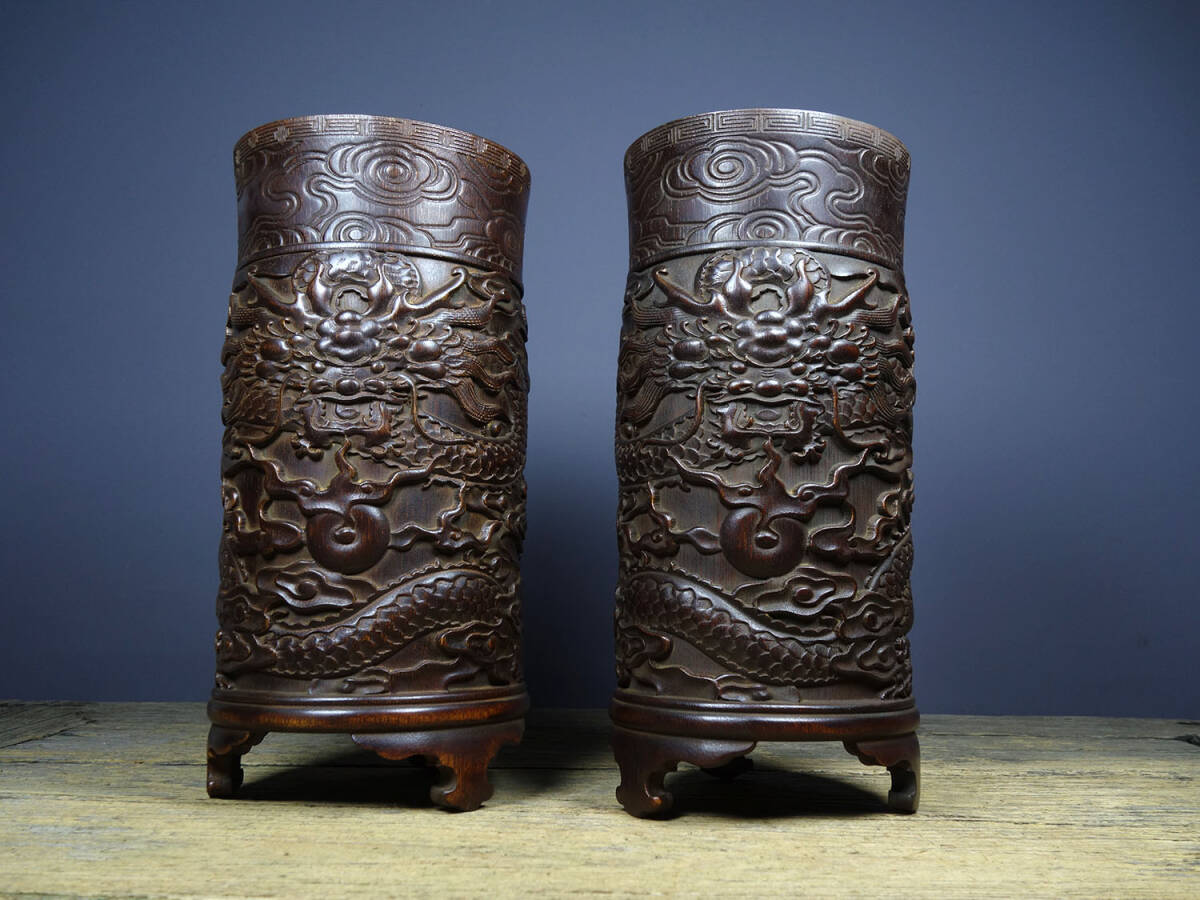 - 唐物 清 竹材細密彫 高筆筒 帽筒一對 筆道具 文房具 極細工 中国美術品 中国古玩 骨董品 D64