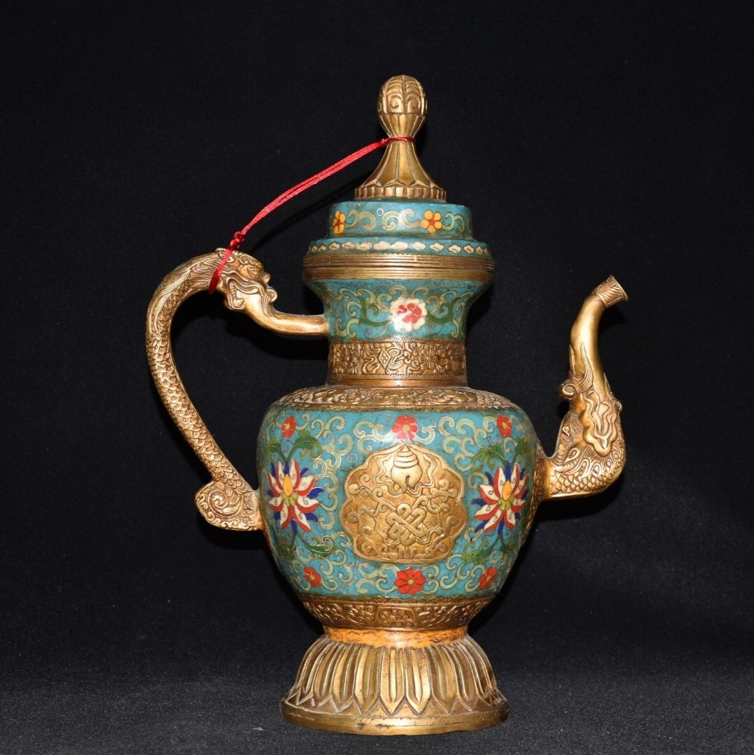 - ▽鴻▽ 銅製 景泰藍 琺瑯彩 塗金 龍頭端把酒壺 置物 賞物 古賞物 中国古玩 中国古美術