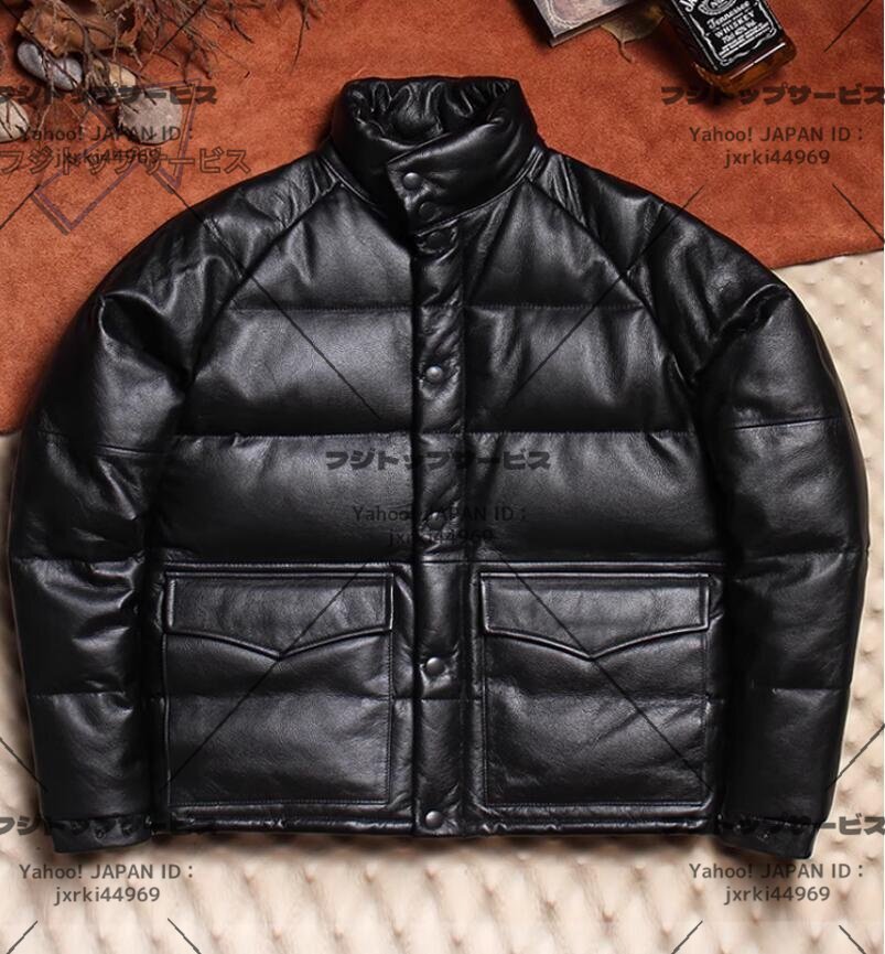 > 人気品 ゆったり本革90%ホワイトダックダウンジャケット防風防寒性バッチリ/冬新品高級牛革レザーコートライダース黒サイズ選択可