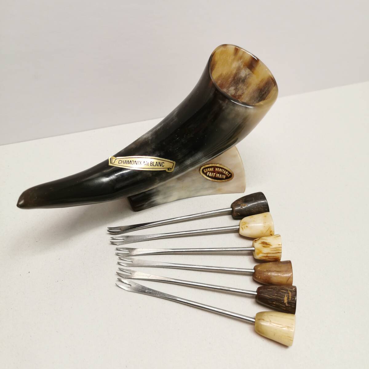 - USED◆フランス シャモニーモンブラン ★ 水牛の角 台 ★フルーツフォーク フルーツピック 6本◆アンティーク お土産品 民芸 角細工