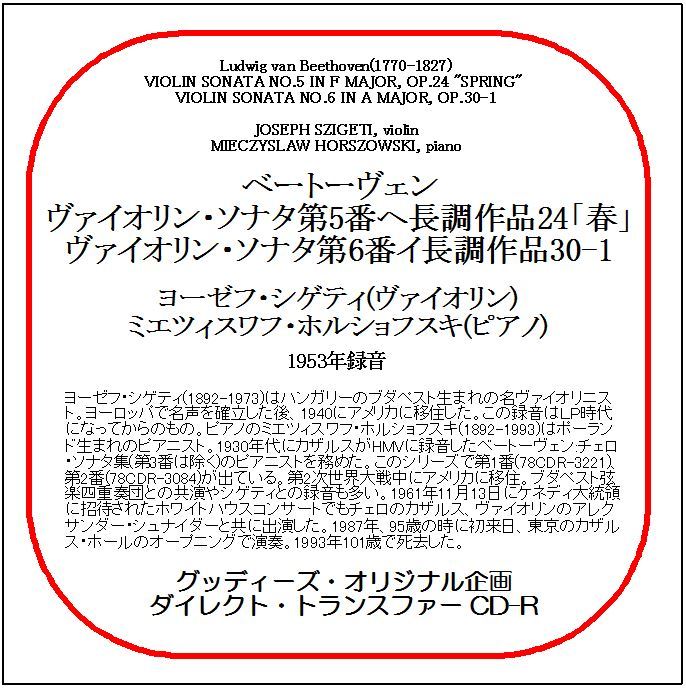 - ベートーヴェン:ヴァイオリン・ソナタ第5番「春」/ヨーゼフ・シゲティ/送料無料/ダイレクト・トランスファー CD-R