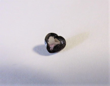 黒っぽい中に少し他色が混じったハート形のサファイアです。何色と言うのが難しい微妙な色合いです。インクルージョンがありますが、透明感とテリがあります。NH