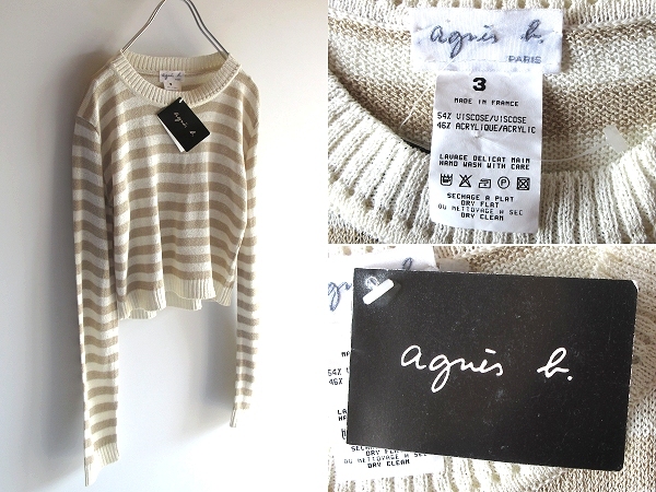 > 希少 タグ付 デッドストック フランス製 90s-00sビンテージ agnes b. アニエスベー ショート丈 ボーダーニット サマーセーター 3 ベージュ