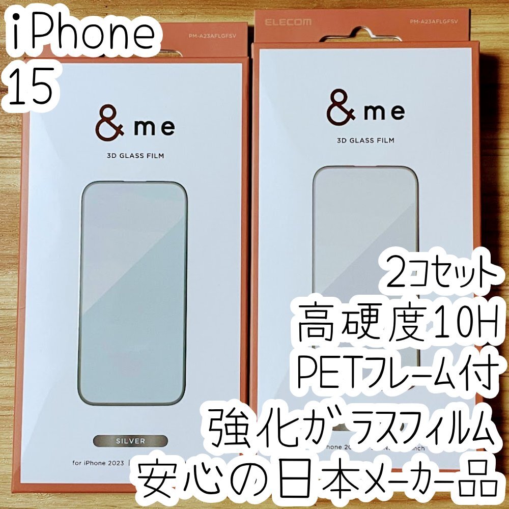 - 2個 iPhone 15 強化ガラスフィルム 3D設計PETフレーム付 高硬度10H 高光沢 液晶保護 シール シルバー エレコム 347
