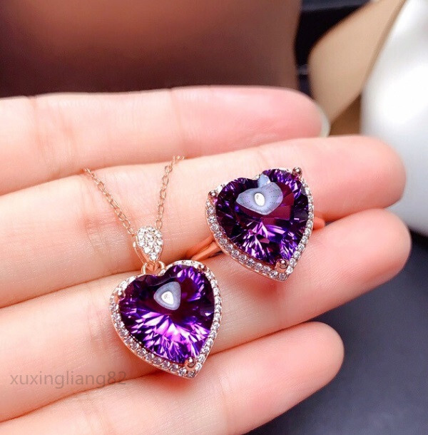 - ジュエリー2点セット ハート形 レディース アメジスト ペンダント ネックレス リング ジルコンアクセサリー チェーン付き