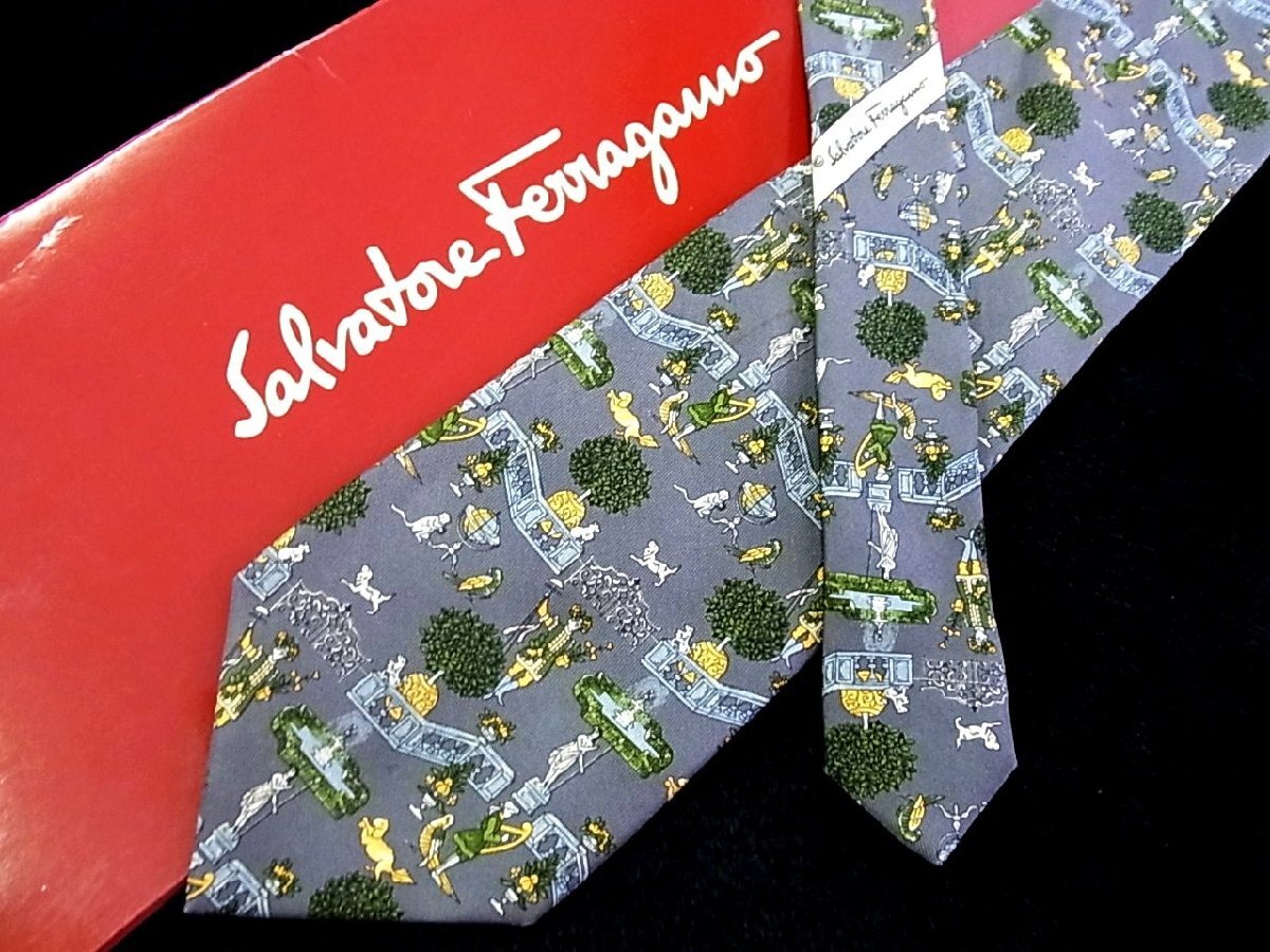 > ★今週の特売★6314★高級ブランド【キャラ柄】★フェラガモ【人 鳥 犬 猿 猫 動物 庭 噴水 柄】ネクタイ★