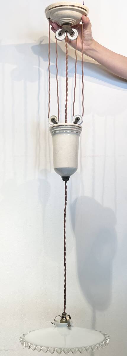 - 【merci】 2-d. フランス 吊り下げ 滑車 ミルクガラス シェード ランプ 古道具 店舗什器 カフェ アンティーク 古民家 蚤の市