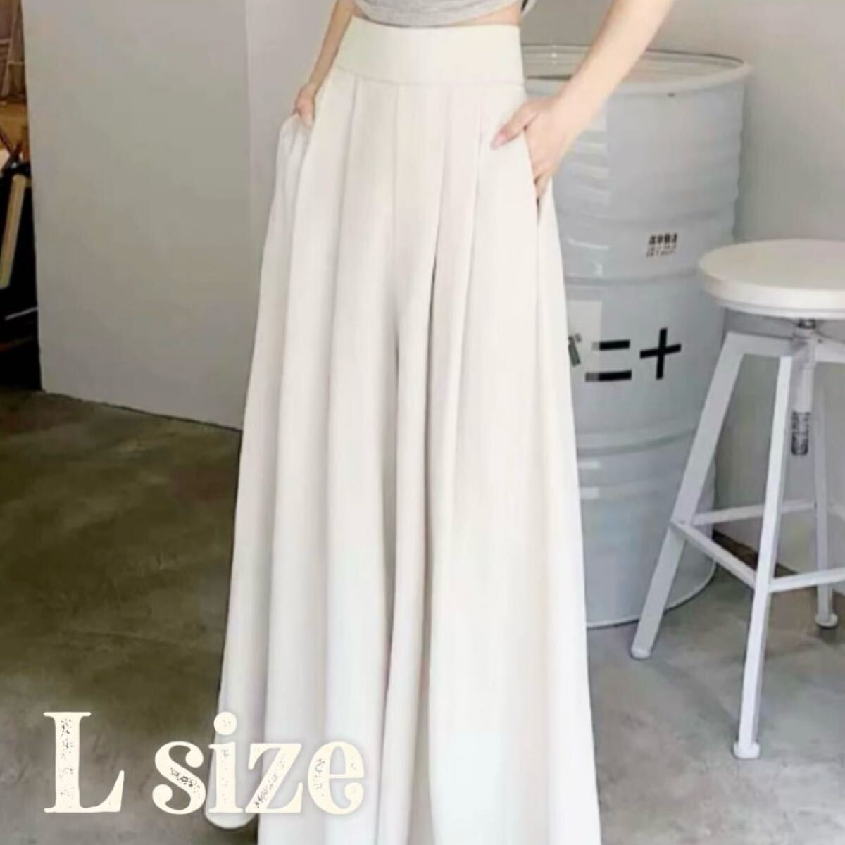 - ハイウエスト ワイドパンツ 楽ちん フレア Aライン ロング 白 L
