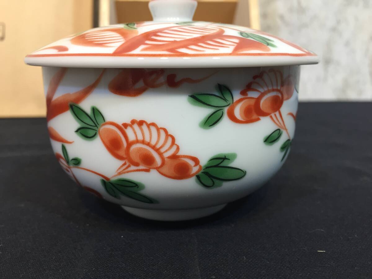 - 『 お茶呑茶碗 蓋付 』5客セット 橘吉 たち吉 茶器 赤絵 花鳥 美濃焼 箱付き コップ 食器 茶道具 ★古時家★
