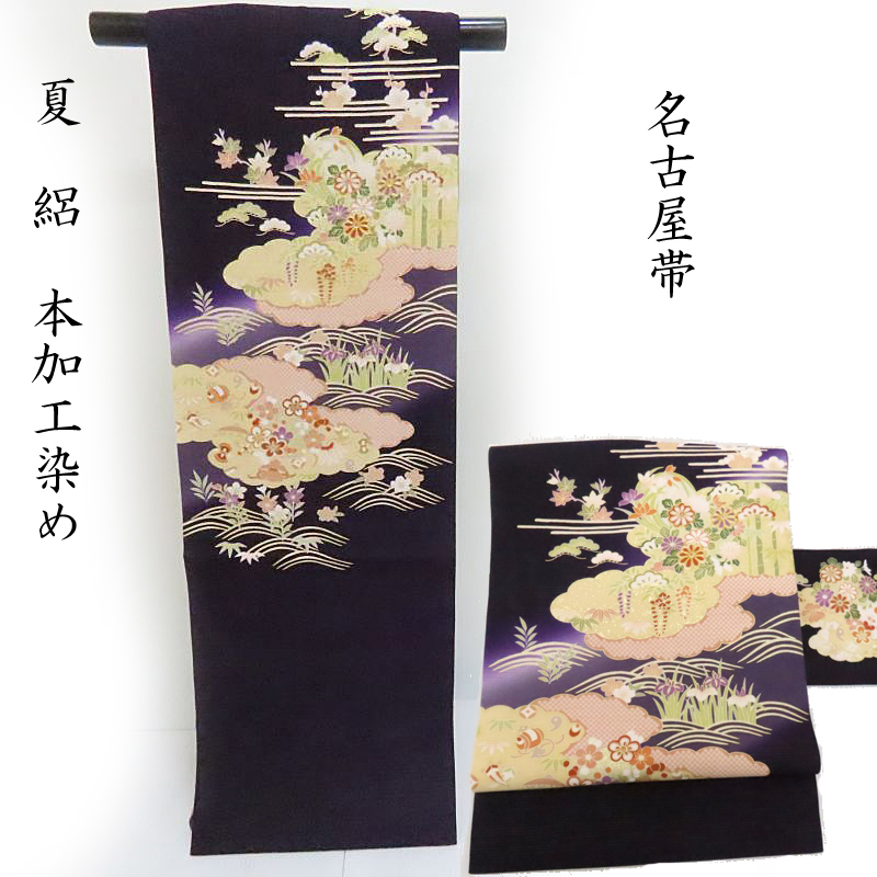 - Club藤★夏 名古屋帯 絽 新品 「無料御仕立付き」十日町友禅染め 漆黒色 金駒刺繍 九寸名古屋帯 御仕立上り(3420)