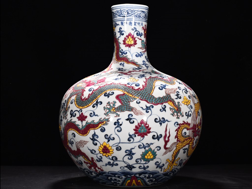 - TA228■中国古玩 唐物 明宣徳青花五彩龍紋天球瓶 時代物 極上品■