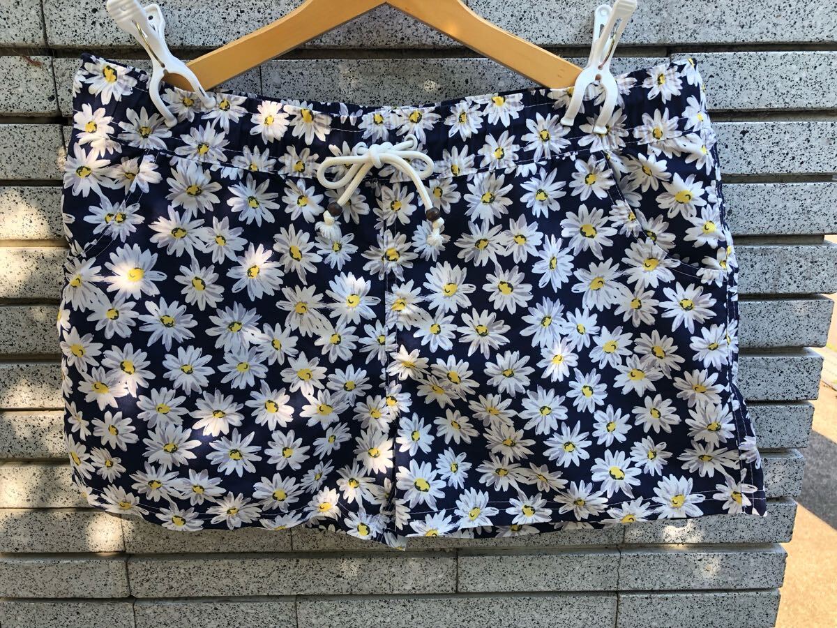 - デイジー 花柄 総柄 ショーツ ショートパンツ 短パン 古着 OP イケオジ OCEANS F&E サーフィン 70's 膝上丈 男女兼用 L XL ネイビー系 水着