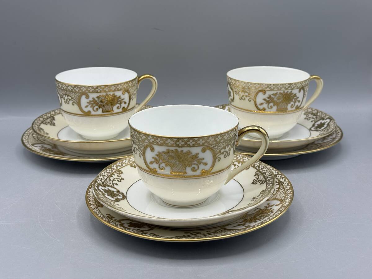 - 里帰り ノリタケ フラワーバスケット 3客 トリオ カップアンドソーサー ケーキ 皿 プレート 金彩 お花 マルキ印 カップ&ソーサー (#-6-C)