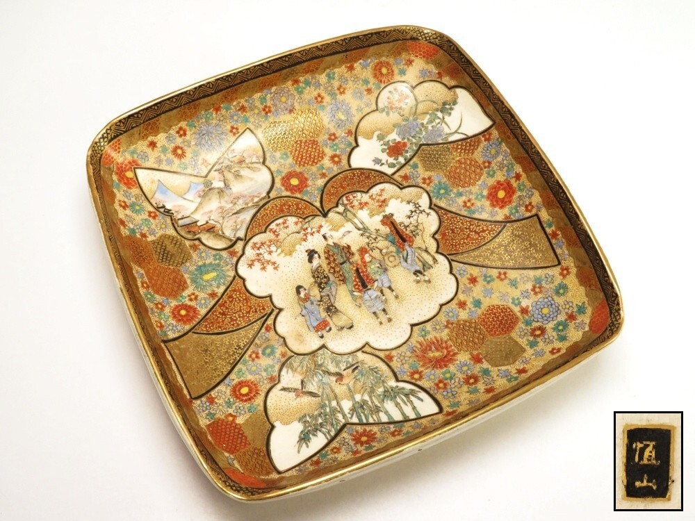 - 【10134】明治期 薩摩焼 人物図 四方 飾り皿(初品・買取品)