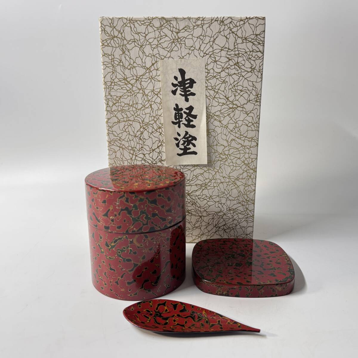 - 【61725Q】未使用 津軽塗 茶筒 茶匙 急須台 3点セット 栞 煎茶道具 伝統工芸品 経年保管品 現状品