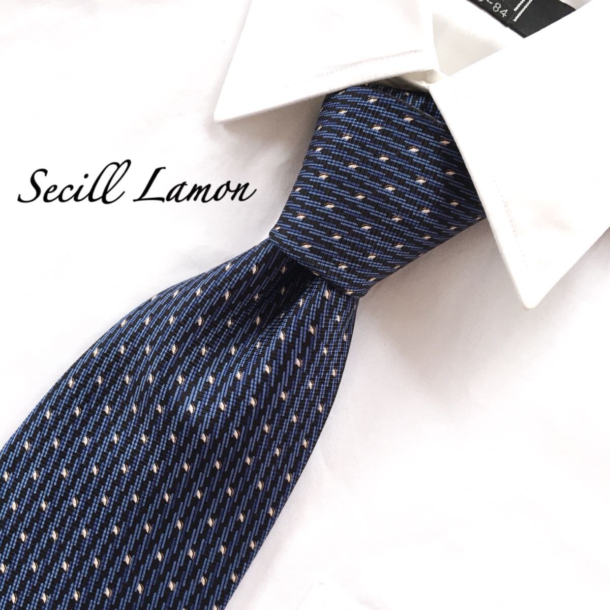 - 美品 Secill Lamon セシルラモン 絹 シルク ネクタイ 絹 100% 青 総柄 小紋柄 ビジネス カジュアル フォーマル メンズ 紳士服 ネイビー