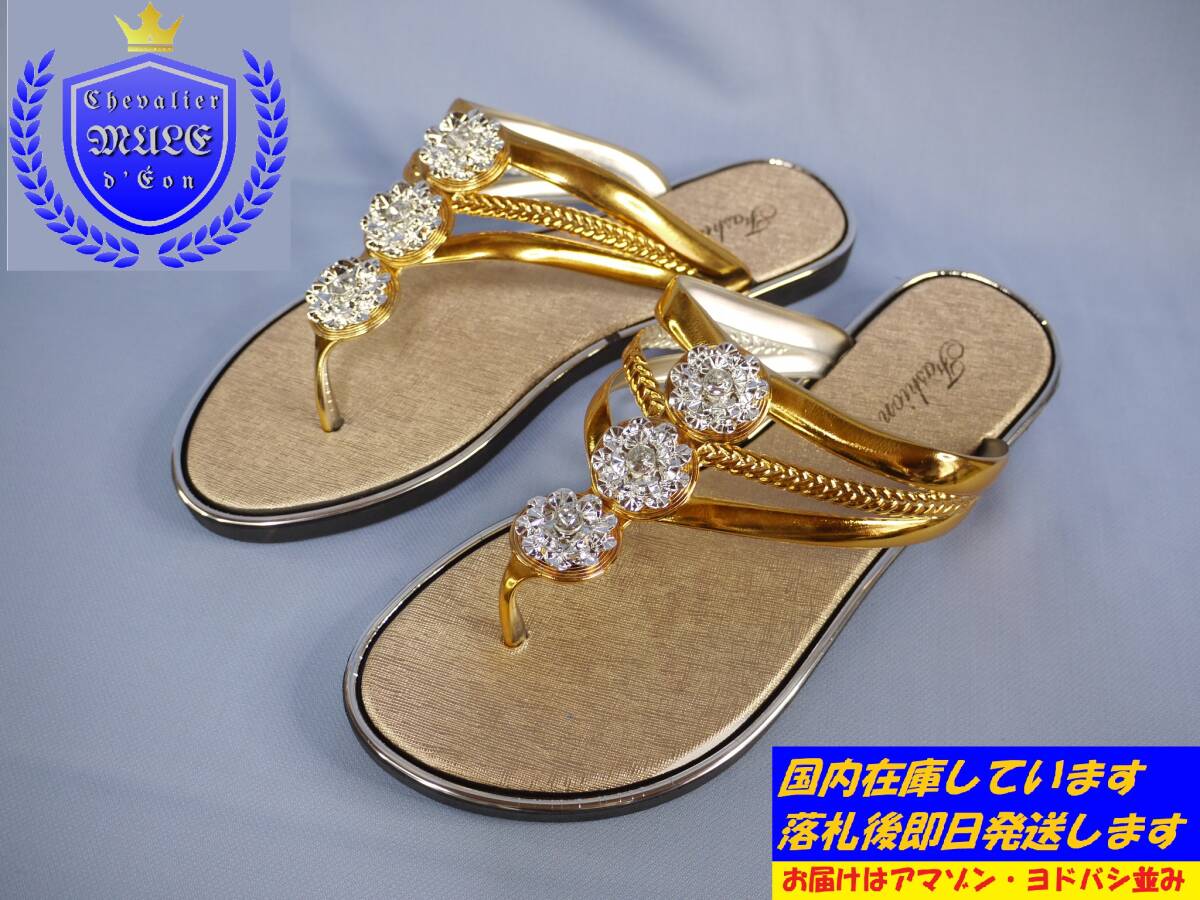 > ★サイズ26.0cm(42)★ゆうパケット発送★ストレートラインクリスタルフラワー付きフラットサンダル◆カラー:ゴールド◆ K36-G-42