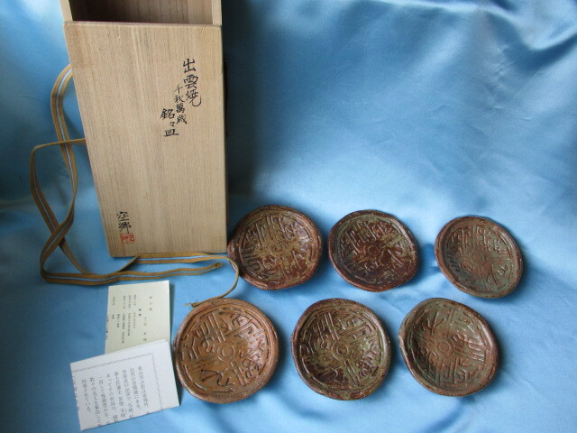 > 出雲焼 楽山焼 十二代 長岡空郷 『 千秋萬歳 』 銘々皿 6客セット 共箱・栞 未使用品