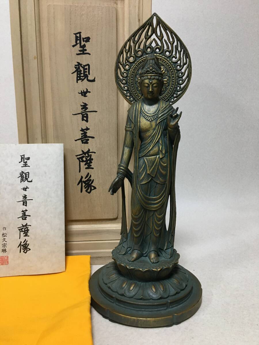 - 【D710】松久宗琳/大仏師 聖観世音菩薩像 高34.5cm 銅像 ブロンズ像 共箱 黄布 木彫り 栞