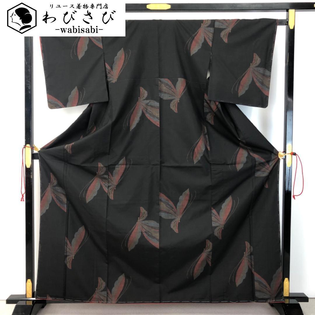 > 本場大島紬 地空き 蝶々 黒色 しつけ糸 K-4746 着物 きもの kimono 和服 和装 中古 リサイクル着物 【送料無料】