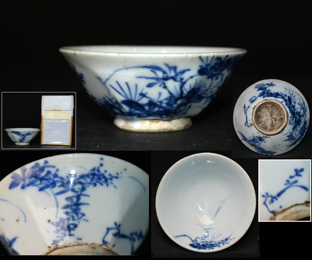 > 京焼 名工■清水七兵衛■ 青華 染付 草花文 盃 箱無 青花 酒器 酒杯 酒盃 ぐい呑 お猪口 古美術 真贋保証