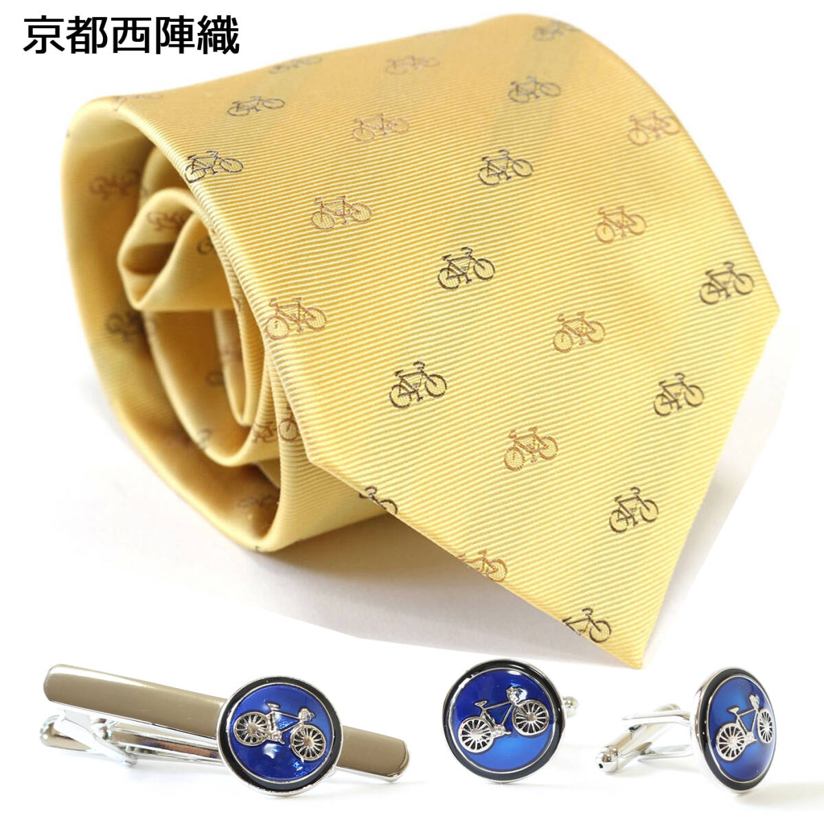 - お得3点セット 自転車ネクタイ+ネクタイピン+カフス 自転車 ネクタイ 京都西陣織 ネクタイ 高級 シルク100% 敬老の日 父の日