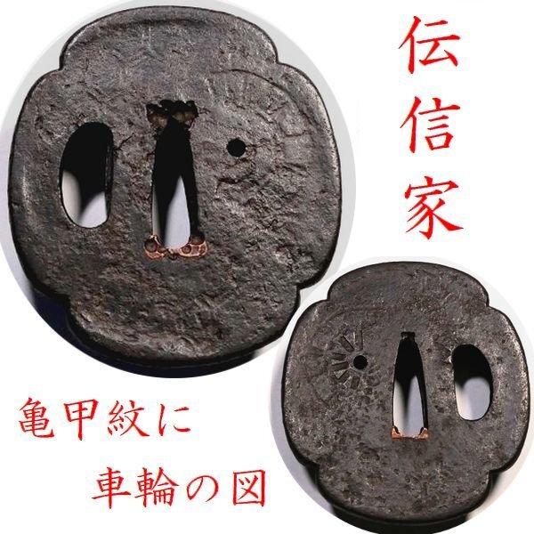 - 【 恵 k0041 】 「伝信家」 ウブ出しにて出てきた作品です 朽ちた箱の中に古き紙が入っており「伝信家」と書付あり 亀甲紋に車輪図鍔