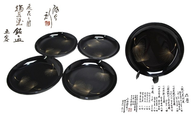 - 《ジャムルK》KKg0516-52◆小西啓介 能登輪島塗 沈金飛花の図 銘々皿 5客 共箱