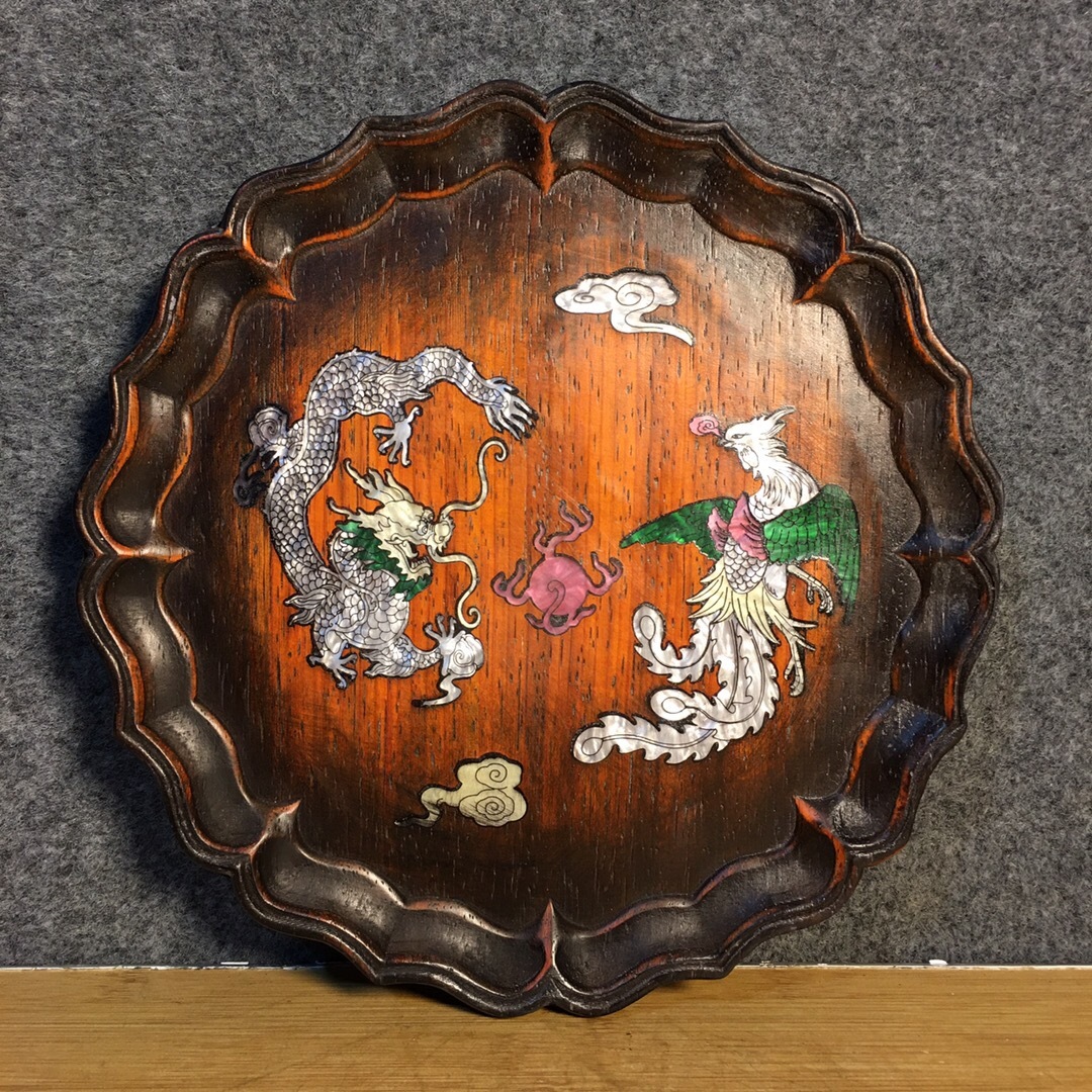 - ▽鴻▽ 檀木製 細密彫 貝殼嵌 彩繪 龍鳳呈祥紋 茶盤 置物 賞物 古賞物 中国古玩 中国古美術