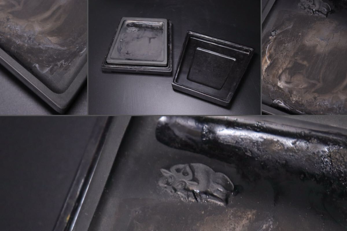 - 時代 兎図 浮彫 古硯 台形 硯箱 付 / 書道具 文房具 文房四宝 検索: 端渓 端渓硯 中国美術 唐木 紫檀 .B160