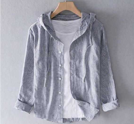 - 長袖シャツ メンズ リネン 日焼け止めジャケット夏 綿麻シャツ パーカ ストライブ柄 フード付き アウター スリム 黒 多色S~4XL選択可/XS230