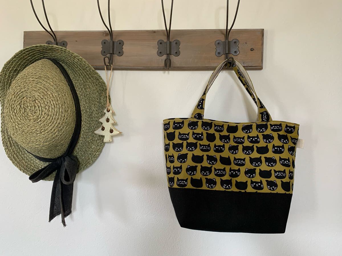 - ハンドメイド トートバッグ 猫柄 白黒 猫 お弁当バッグ マスタード