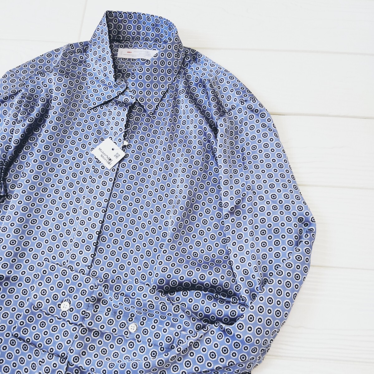 > 未使用*MAKER'S SHIRT KAMAKURA*鎌倉シャツ*長袖ブラウス*サテン*総柄*水色系*比翼ボタン*洗えます*日本製