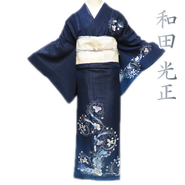 > 特選 訪問着 着物 中古 正絹 袷 伝統工芸士 和田光正 銀彩 花模様 反端付き 銀通し 濃紺色 多色 身丈157cm 裄66cm M きもの北條 A1194-7