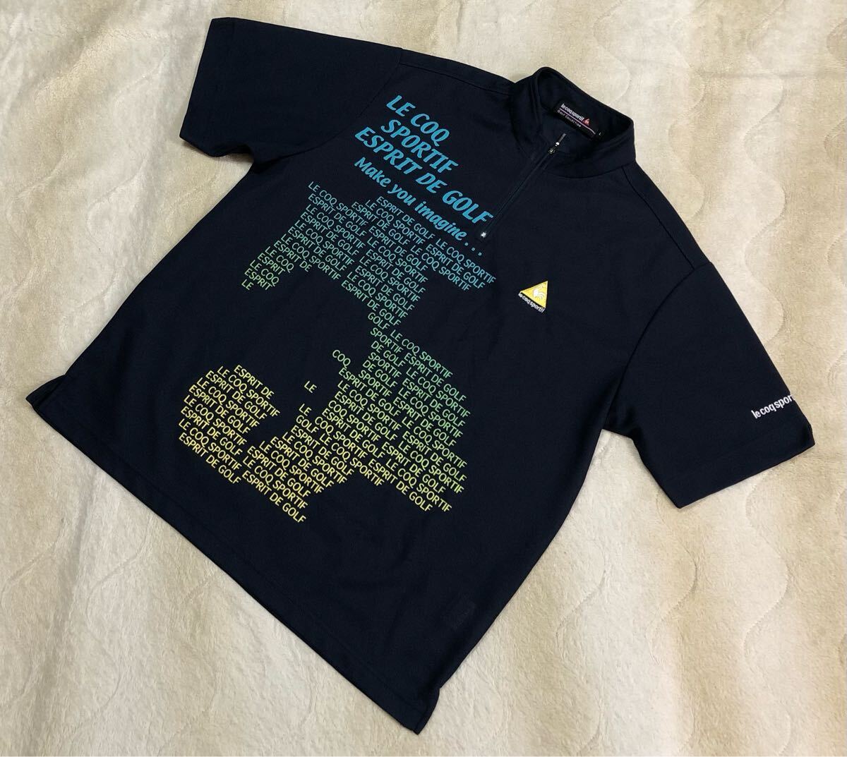 > ☆ルコック ゴルフ☆ビッグロゴ モック 半袖 ハーフジップ シャツ L 紺系 織生地 ポロシャツ トレーニング QG1954