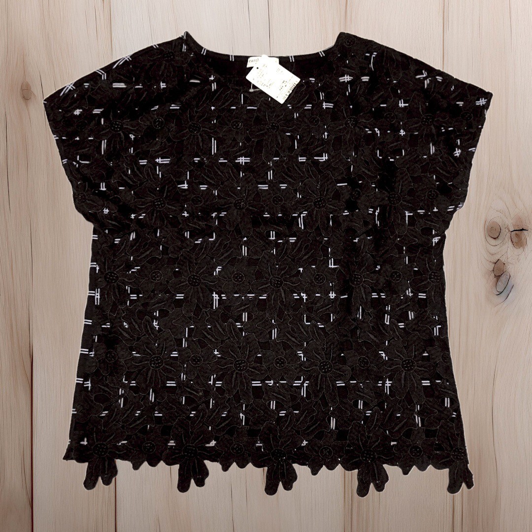 - 2416 送料無料 新品タグ付き earth フラワーフロントレースウィンドペンプルオーバー ブラック フリーサイズ 半袖 カットソー トップス 黒
