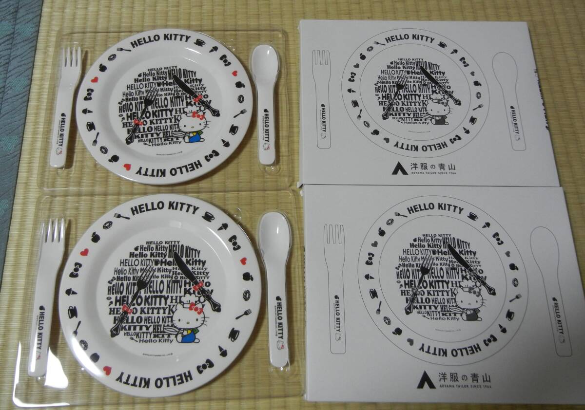 > ハローキティ 食器2セット 皿(直径20cm)ナイフ フォーク プレート メラミン キティちゃん カトラリー サンリオ 洋服の青山 未使用非売品