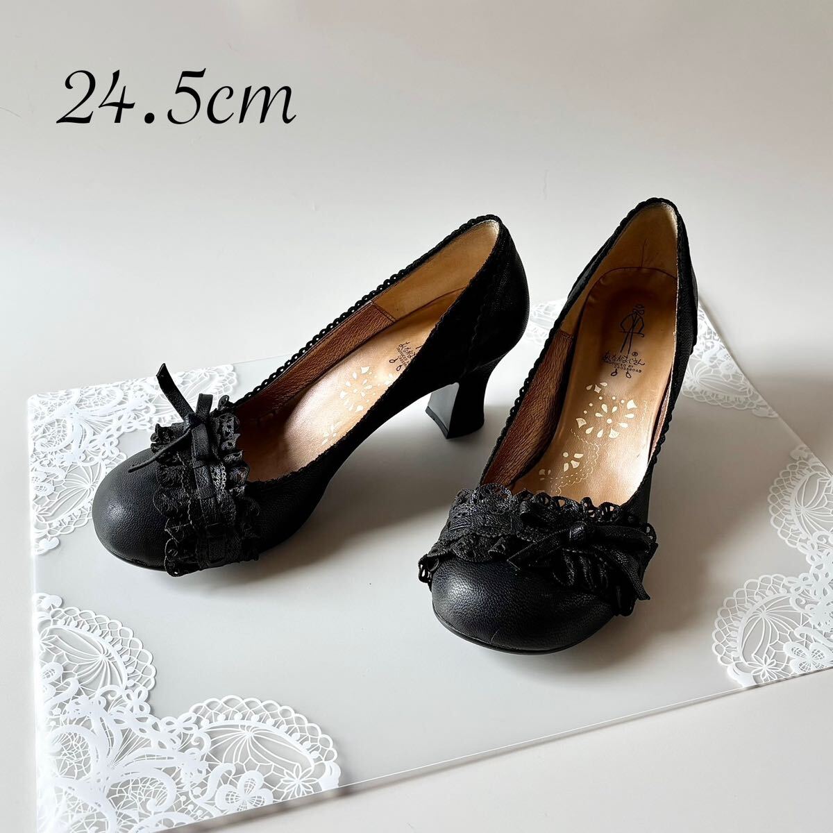 > 24.5cm 本革 あしながおじさん フリル レース リボン パンプス 靴 黒 ブラック ヒール6.8cm かわいい ラウンドトゥ ★靴下への色移り注意★