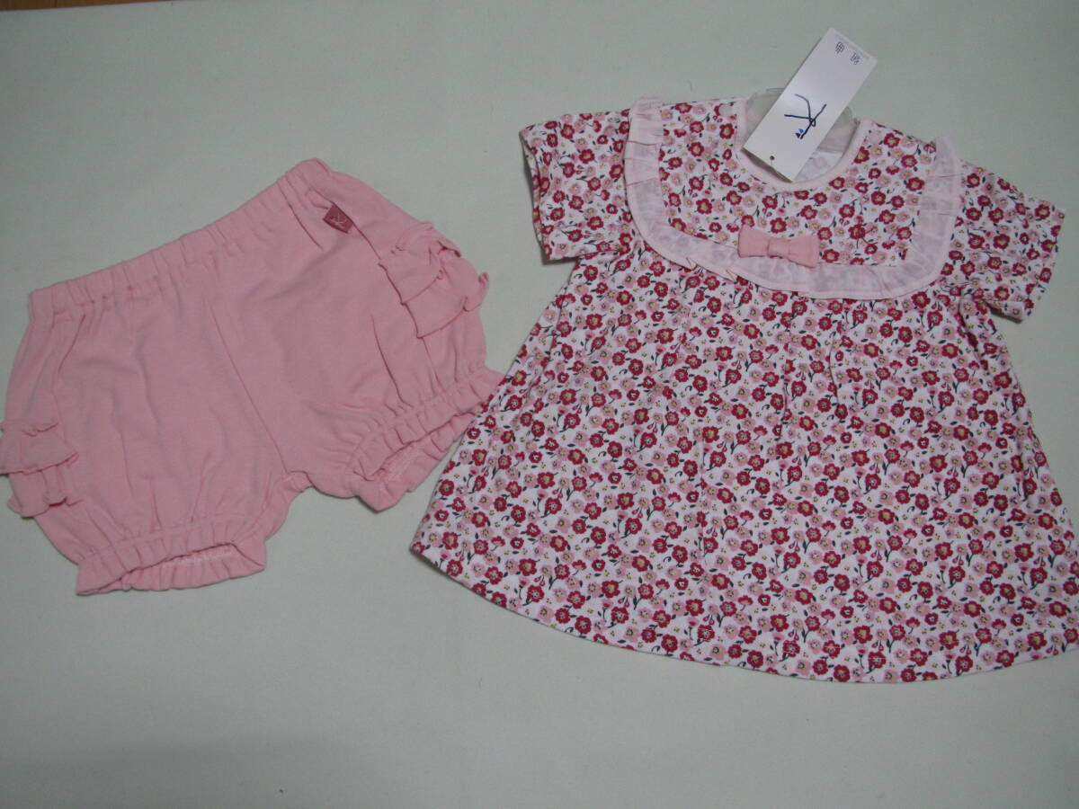 > 新品 ¥5500 組曲 クミキョク Kumikyoku 2点 セットアップ 半袖 チュニック ワンピース スパッツ 女の子 80cm ベビー 出産祝い ピンク 赤