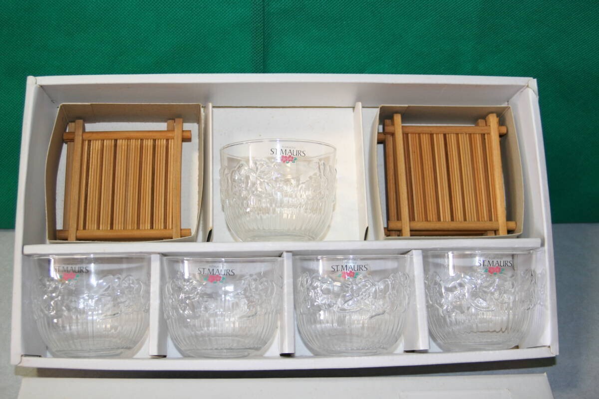 - エーデル製品 サン・モール 冷茶セット ガラス製品 (グラス/受け皿 5客) 木の受け皿 未使用 長期保管品 日本製